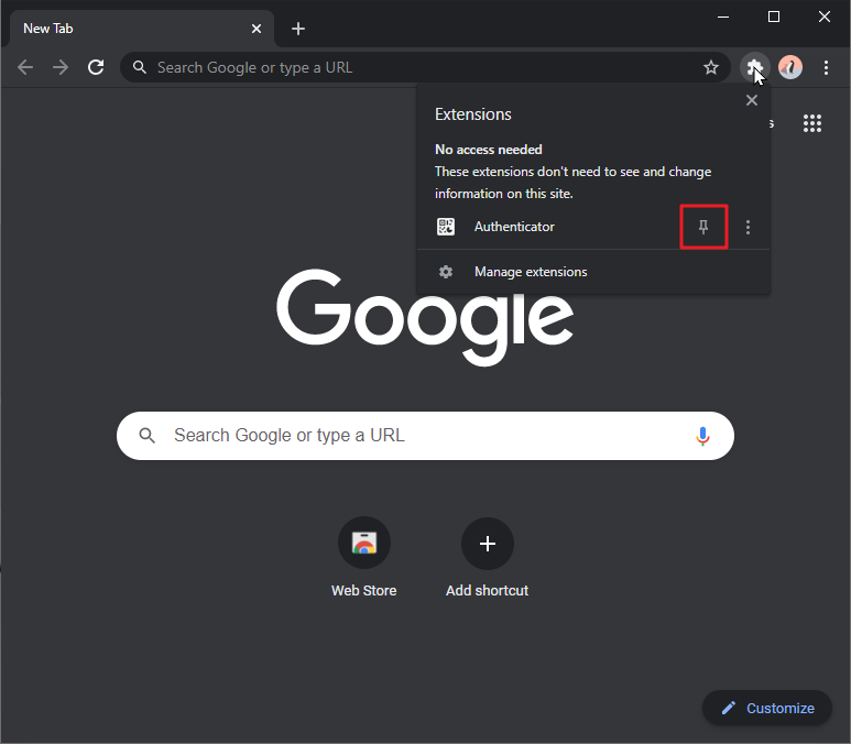 - وقتی افزونه Authenticator را برای اولین بار در مرورگر کروم نصب میکنید، باید آیکون آن را به نوار ابزار پین کنید.