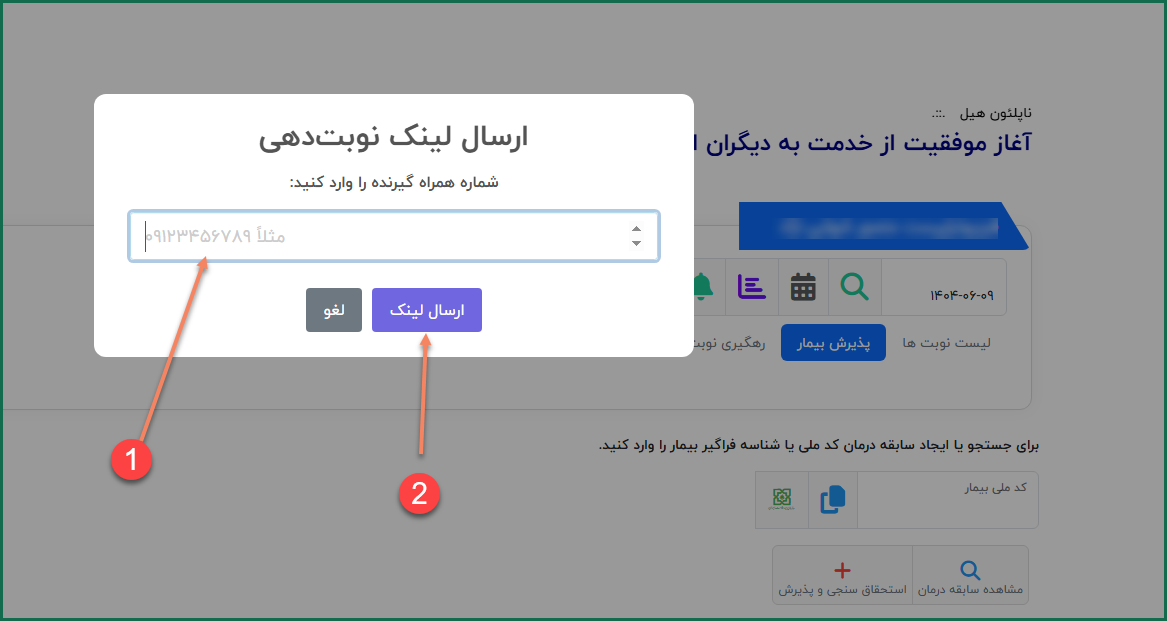 - سپس شماره بیمار را وارد کرده و گزینه "ارسال لینک" را کلیک کنید.