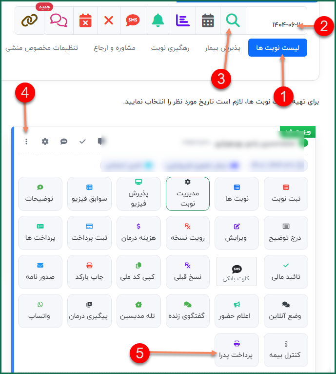 - در پنل مخصوص پذیرش در قسمت لیست نوبت ها، ابتدا تاریخ مورد نظر را وارد کرده و روی آیکون "ذره بین" کلیک کنید تا لیست نوبت ها نمایان شود.