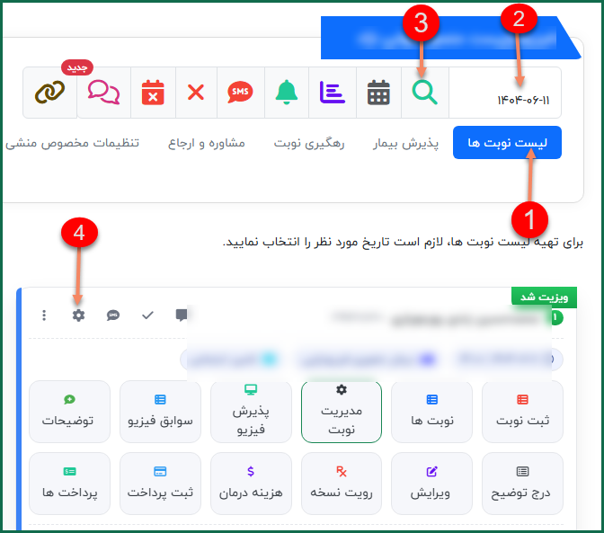 - در پنل مخصوص پذیرش در قسمت لیست نوبت ها، ابتدا تاریخ مورد نظر را وارد کرده و روی آیکون "ذره بین" کلیک کنید تا لیست نوبت ها نمایان شود.