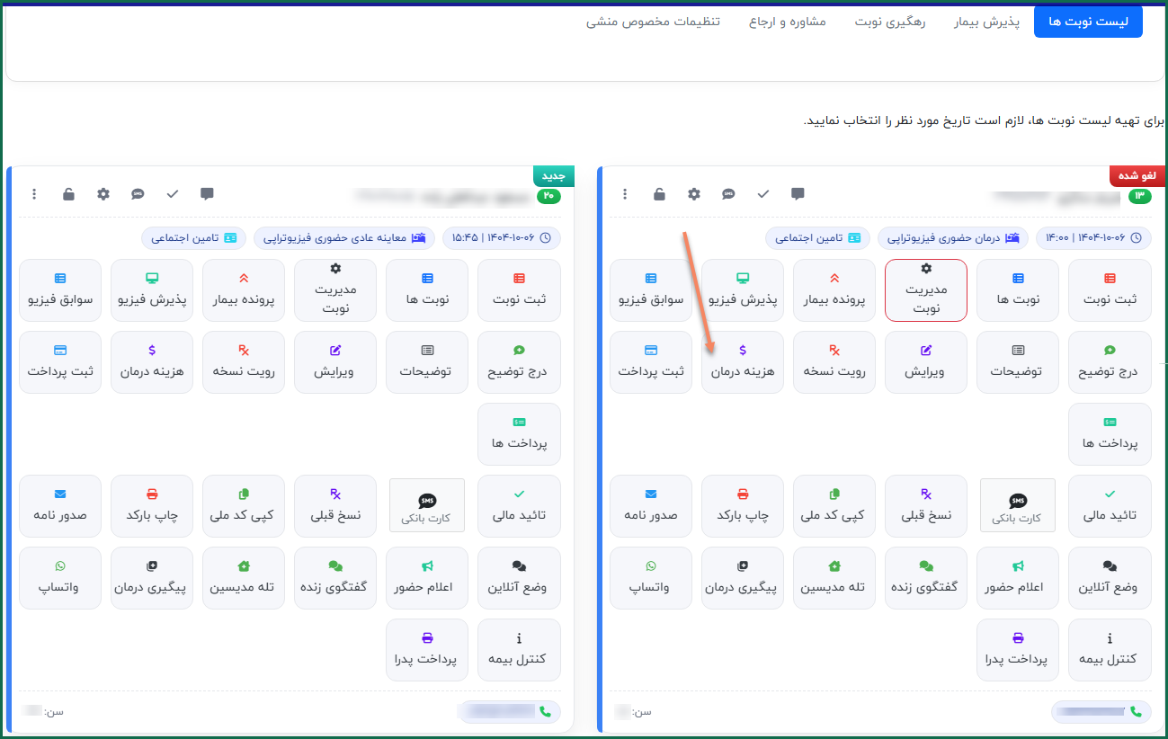 - در پنل مخصوص پذیرش در لیست نوبت ها بیمار مورد نظر را پیدا کرده.