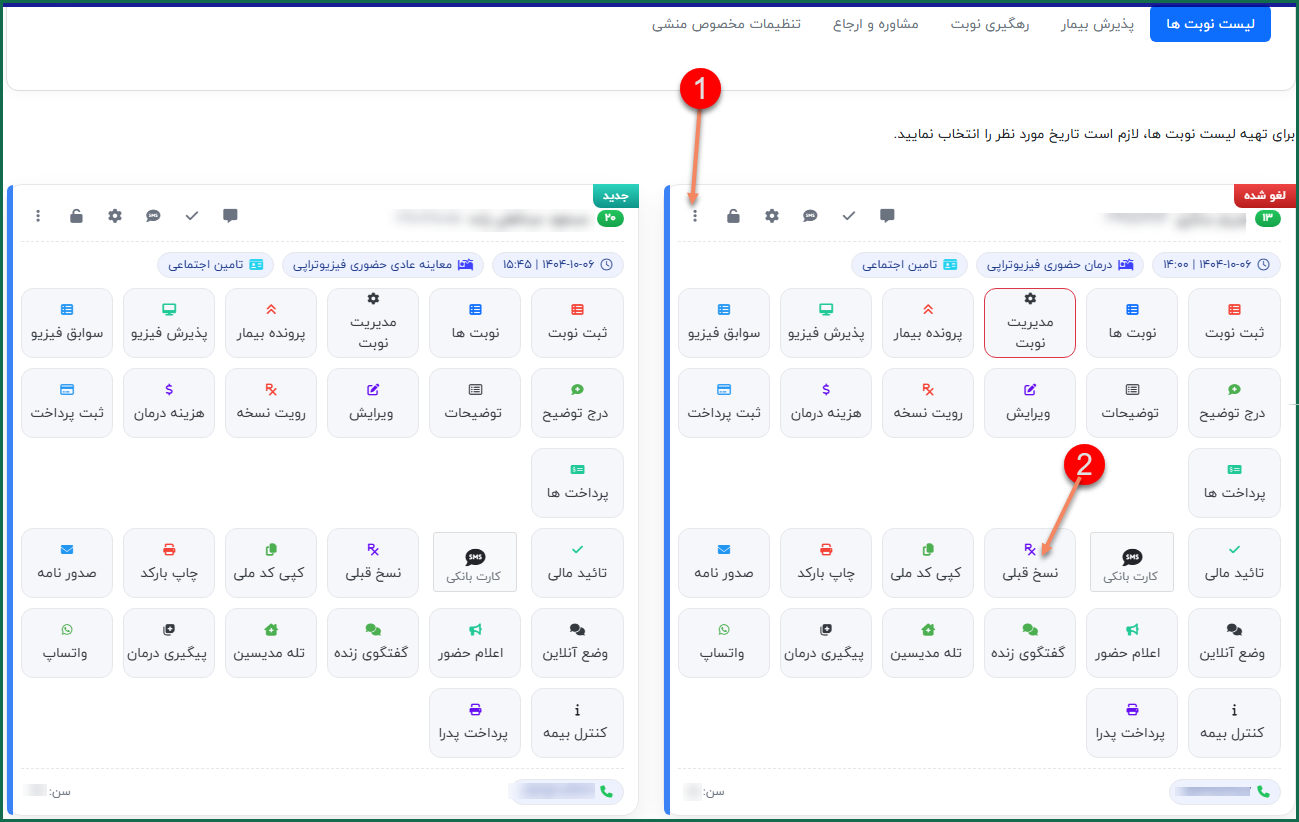 - در پنل مخصوص پذیرش در لیست نوبت ها بیمار مورد نظر را پیدا کرده.