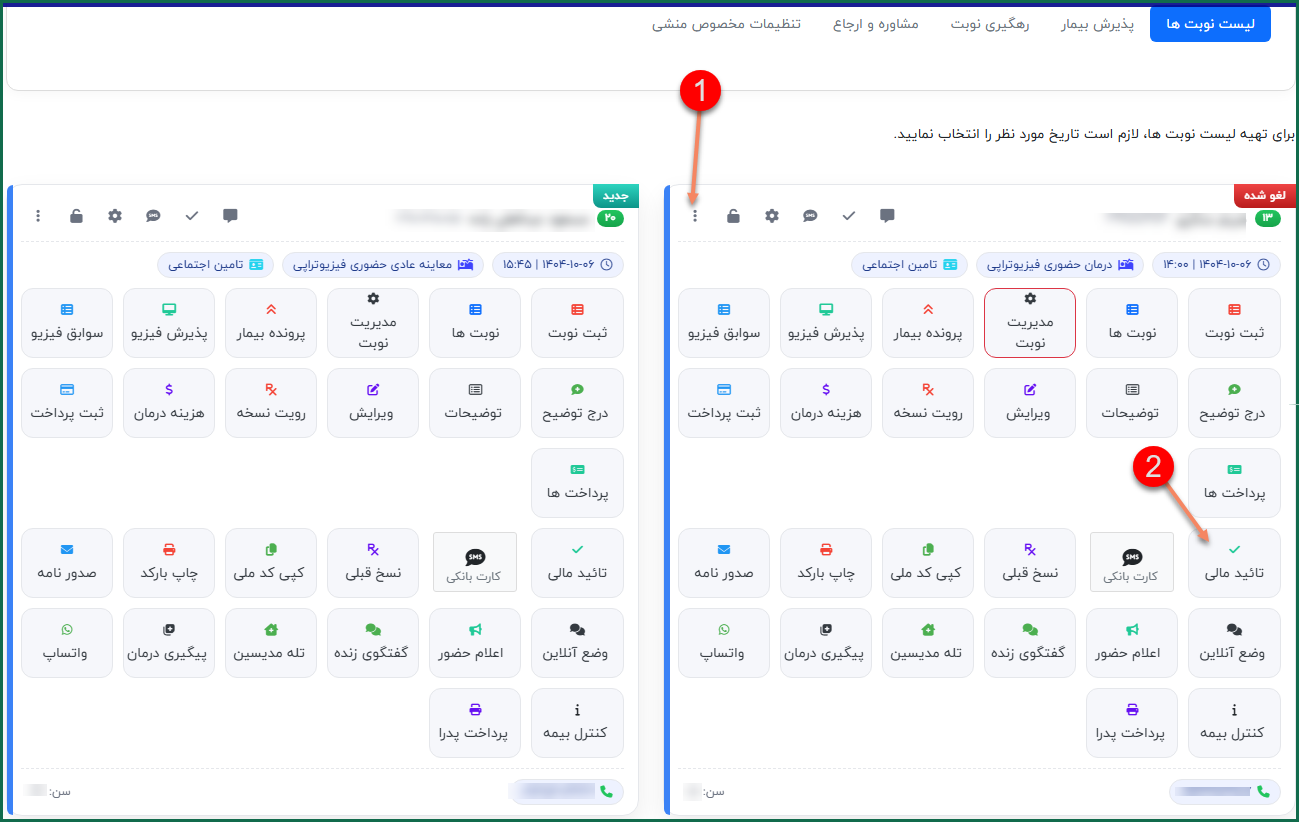 - در پنل مخصوص پذیرش در لیست نوبت ها بیمار مورد نظر را پیدا کرده.